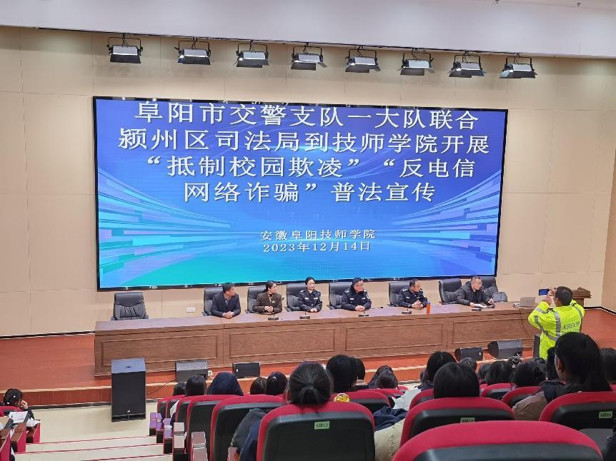 2023年12月14日,阜阳市技师学院保卫处邀请阜阳市交警支队一大队联合颍州区司法局到技师学院开展“预防青少年违法犯罪”、“反电信网络诈骗”普法宣传。