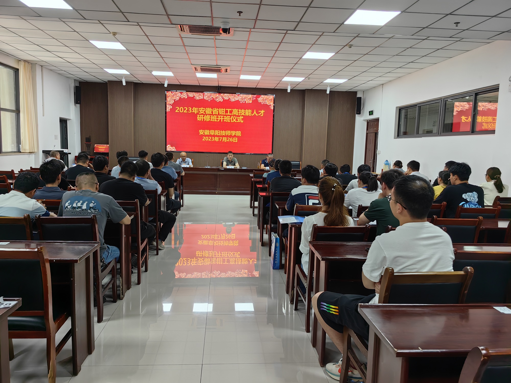 2023年安徽省钳工高技能人才研修班于7月26日上午举行了开班仪式。本次研修活动为期四天,以专题讲座、交流、实训操作及考核的形式进行。阜阳市人社局职建科科长齐雷参加了开班仪式,仪式结束后全体学员参观了学院。