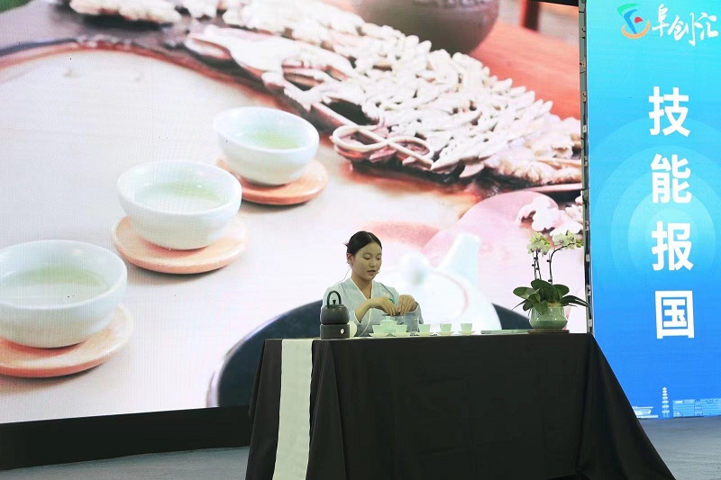 本次大赛由阜阳市人力资源和社会保障局、市共青团、市妇联等多家单位联合主办,旨在弘扬工匠精神,推动职业技能人才队伍建设。在茶艺比赛项目中,陈诗雯以精湛的茶艺展示惊艳了全场。她巧妙地将传统茶艺与现代审美相结合,气定神闲、举止优雅,温具、置茶、冲泡、奉茶,通过精湛的技艺和优美的动作,将茶艺的魅力展现得淋漓尽致。她的表演不仅赢得了评委们的一致好评,也赢得了现场观众的阵阵掌声。最终,陈诗雯凭借出色的表现,脱颖而出,荣获茶艺比赛项目一等奖。