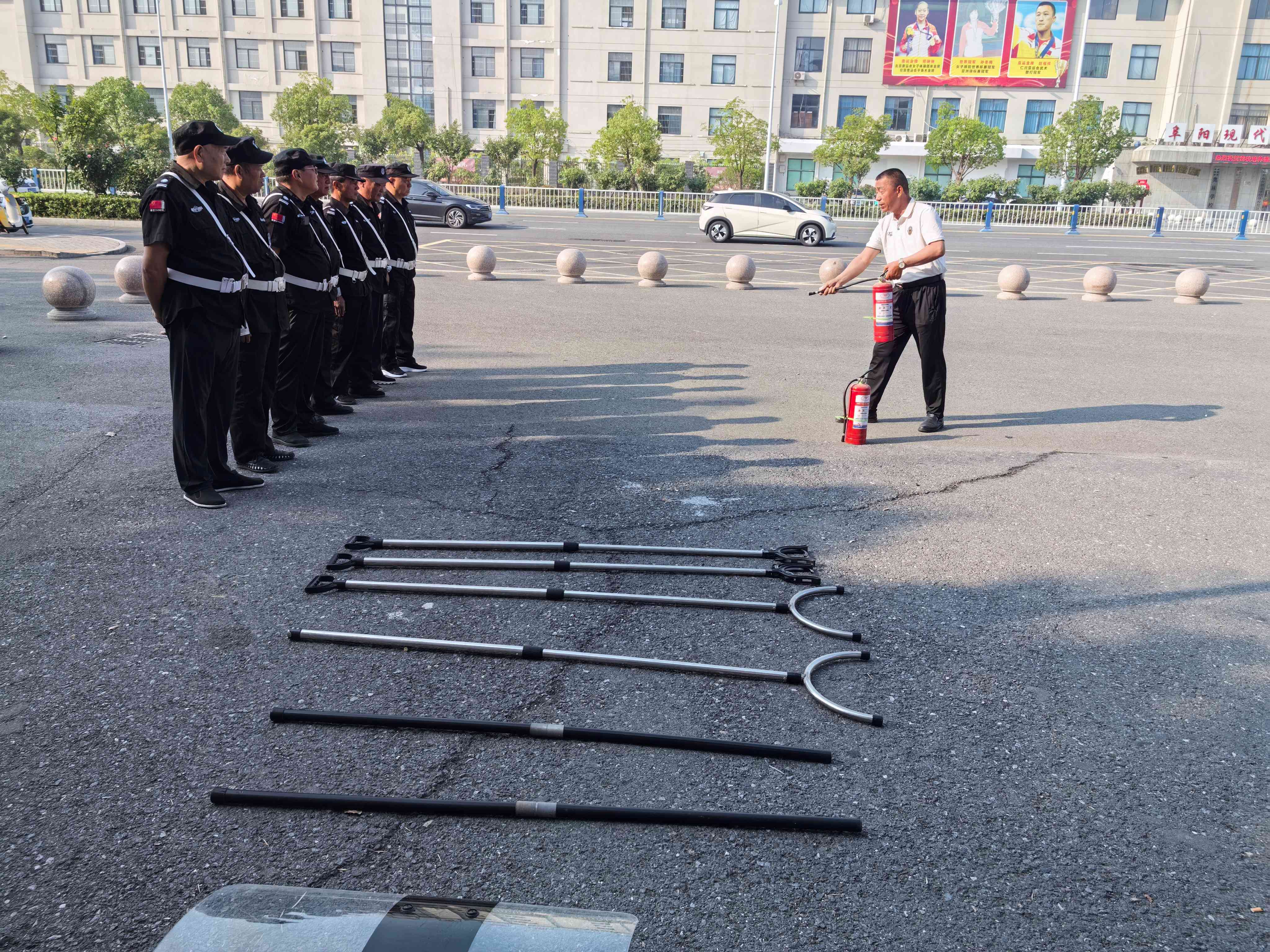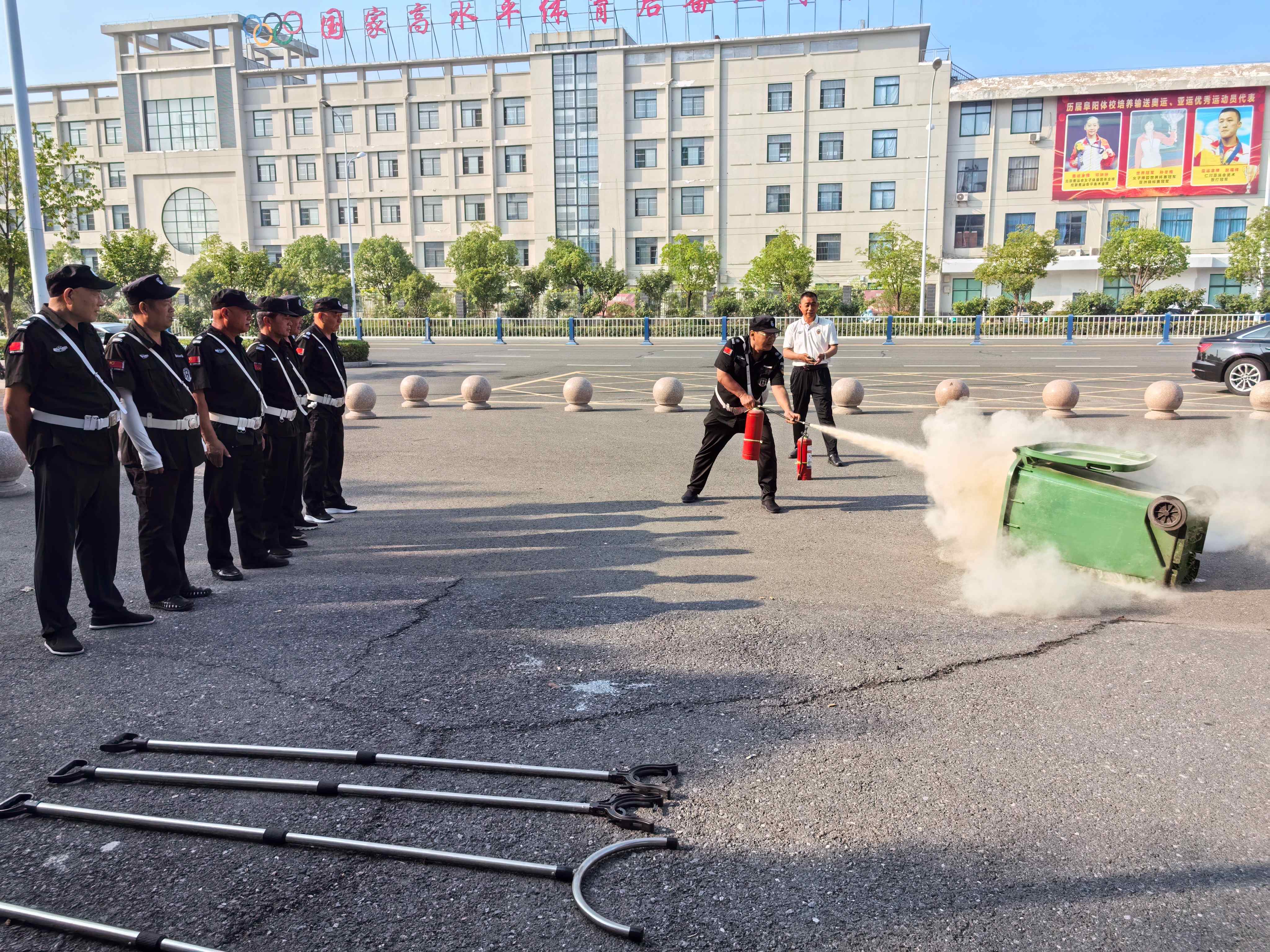 演练现场模拟了一名“暴徒”企图强行闯入校园的场景。校园保安人员迅速反应,按照反恐防爆应急预案,手持盾牌、钢叉等防暴器械,与“暴徒”展开激烈对抗。在保安人员的紧密配合和果断处置下,“暴徒”很快被制服并带离现场。整个演练过程紧张逼真,参演保安人员分工明确、行动迅速、处置得当,充分展现了良好的专业素质和应急处置能力。演练还包括了消防器材的正确操作使用,全面检验了学校在应对突发事件时的组织协调和综合保障能力,为师生创造一个平安、和谐的学习和工作环境。
