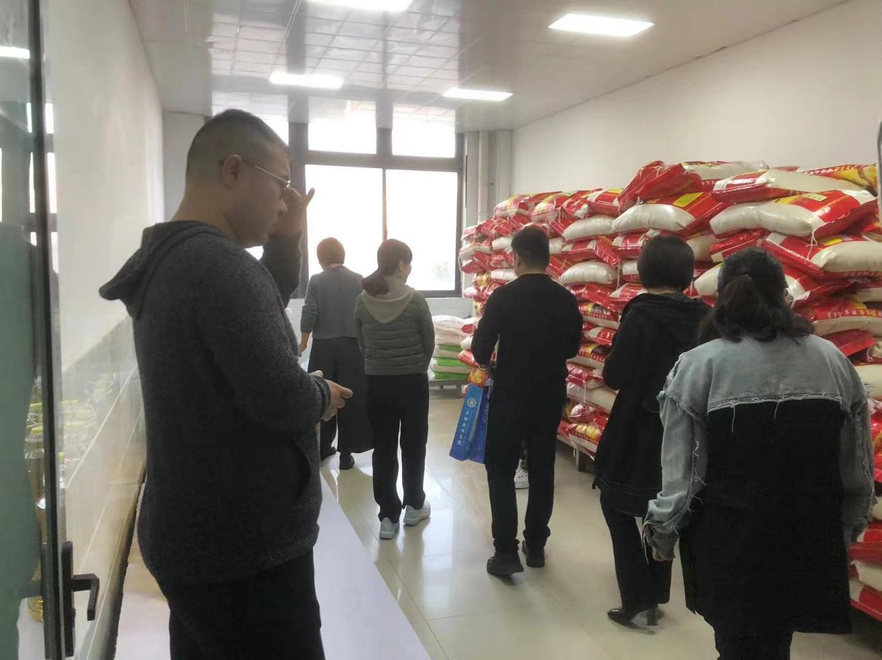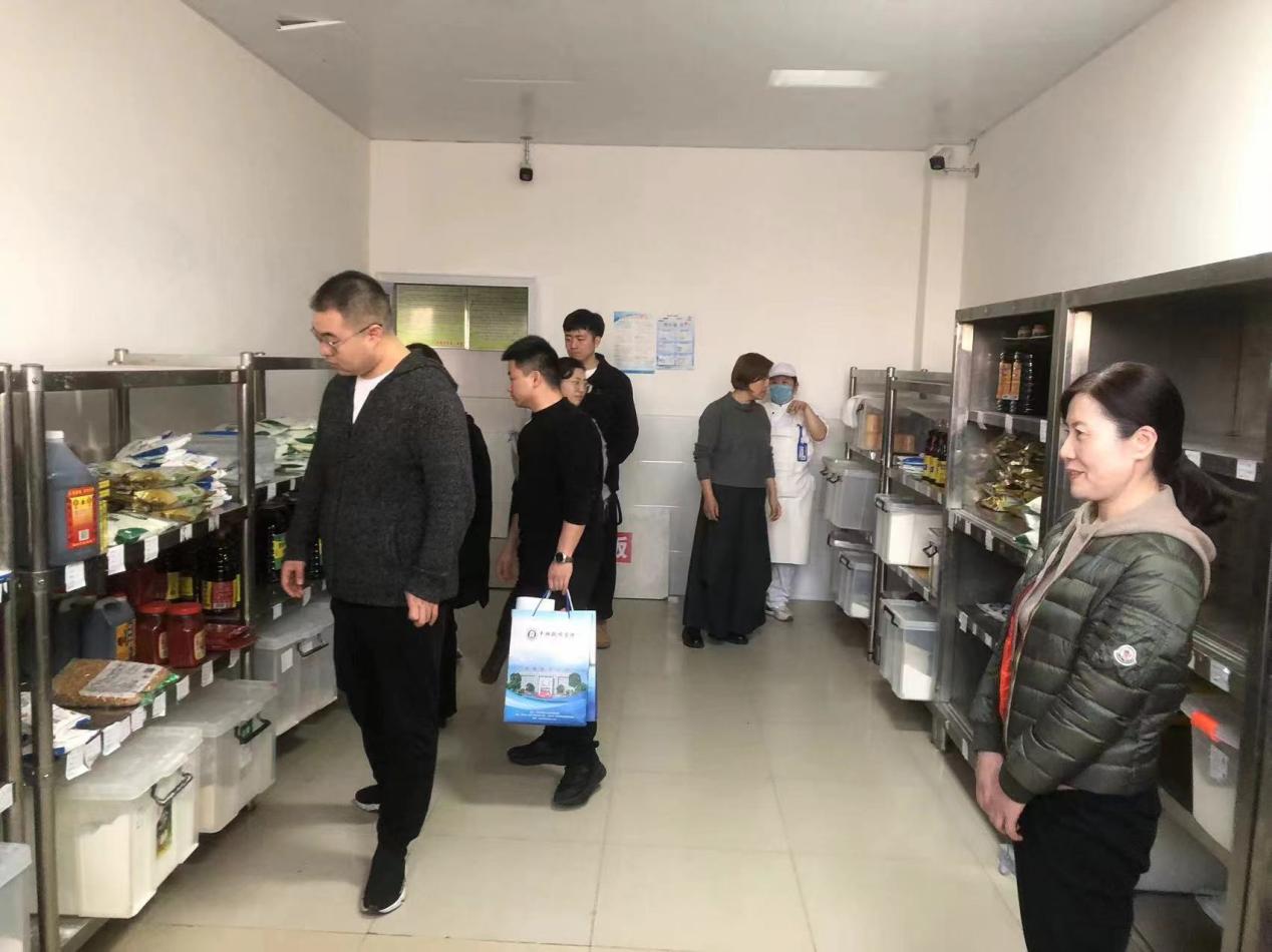 总务处对食堂后厨进行检查,查看食材及进货、留样等台账记录。